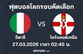 จะดูอิตาลี vs ไอร์แลนด์เหนือ วันไหน ศึกเพลย์ออฟรอบคัดเลือกฟุตบอลโลก 2026 แมตช์นี้จะแข่งตามโปรแกรมช่วงดึกของคืนวันพฤหัสบดีที่ 26 มีนาคม 2026 เวลา 20:45 น. ตามเวลายุโรปกลาง หรือเช้ามืดของวันศุกร์ที่ 27 มีนาคม 2026 เวลา 02:45 น. ตามเวลาประเทศไทย